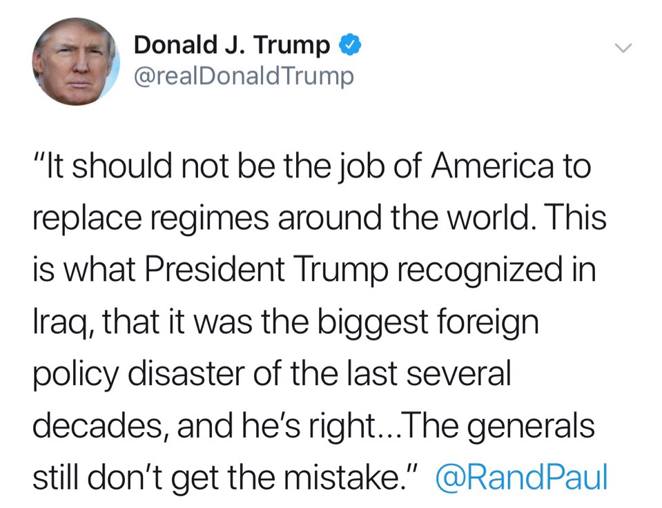 "Amerika by se neměla zapojovat do změny režimu po celém světě. To uznává prezident Trump. Irák měl v posledních několika desetiletích největší katastrofu v oblasti zahraniční politiky a má pravdu ... Generálové stále nechápou své chyby. "