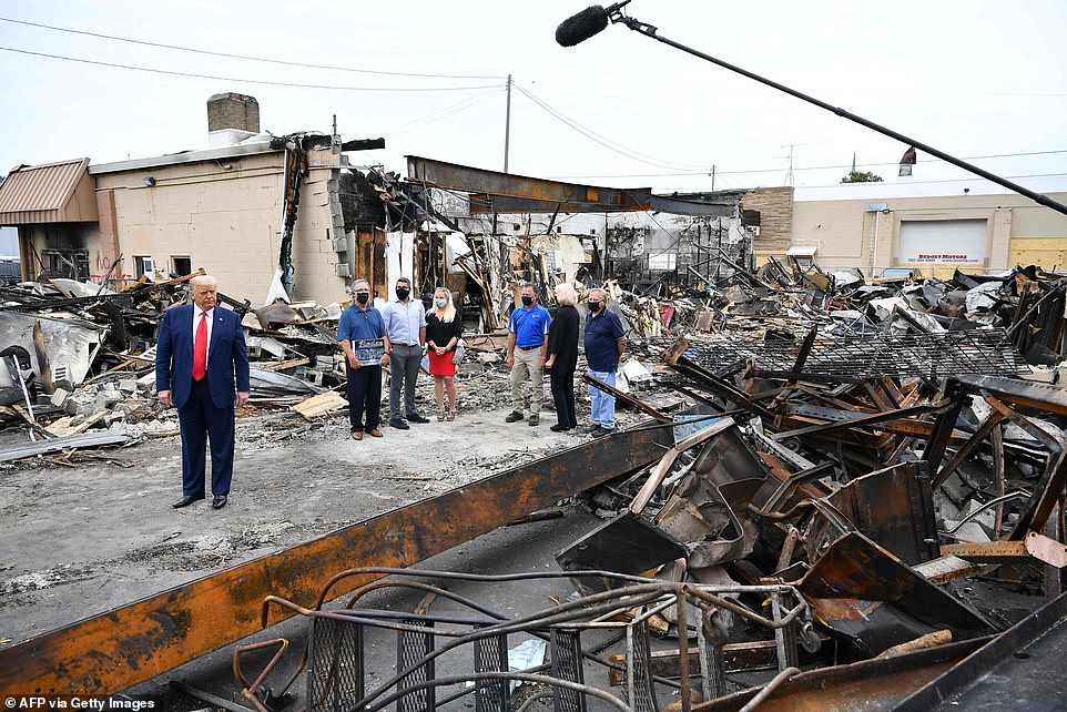 Prezident Trump prohlíží škody po protestech v Kenosha ve státě Wisconsin, po nedělní policejní střelbě na Jacoba Blakea