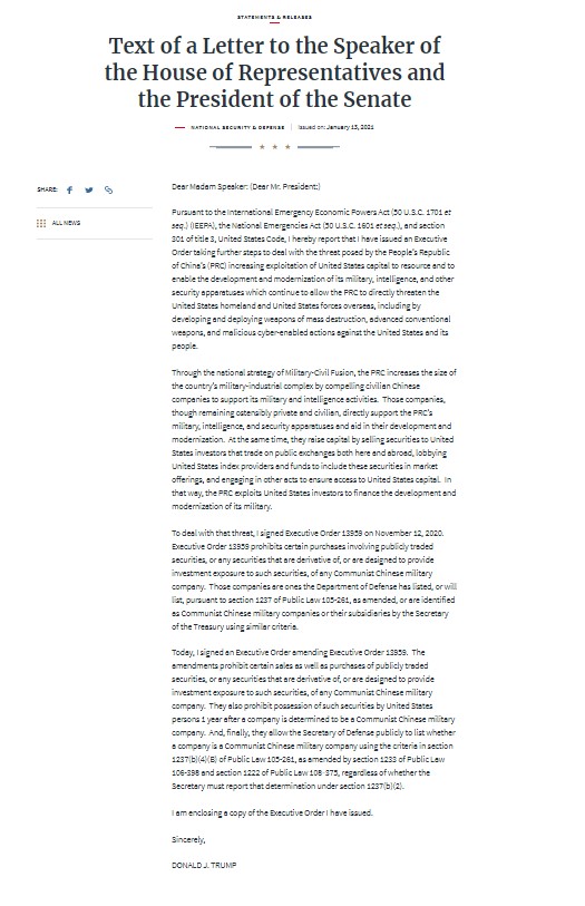Dnes jsem podepsal výkonné nařízení, kterým se mění výkonné nařízení 13959. Dodatky zakazují určité prodeje i nákupy veřejně obchodovatelných cenných papírů nebo jakýchkoli cenných papírů, které jsou odvozeny od těchto komunistických čínských vojenských společností nebo jsou určeny k zajištění jejich investiční expozice. Zakazují také držení těchto cenných papírů osobami ze Spojených států jeden rok poté, co je společnost identifikována jako komunistická čínská vojenská společnost. A konečně umožňují ministru obrany zveřejnit, zda je společnost čínskou komunistickou vojenskou společností, a to na základě kritérií uvedených v oddíle 1237 (b) (4) (B) veřejného práva 105-261 ve znění oddílu 1233 Veřejného práva 106–398 a oddílu 1222 veřejného práva 108–375, bez ohledu na to, zda musí ministr toto rozhodnutí oznámit podle § 1237 písm. B) odst. 2.