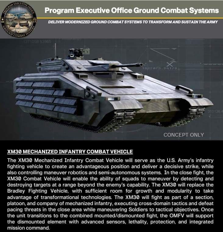 Americká armáda zverejnila "koncept" nového bojového vozidla pechoty XM30, ktoré má nahradiť BMP Bradley. Pripomeňme, že predchádzajúcich niekoľko pokusov nahradiť staršie BMP zlyhalo.