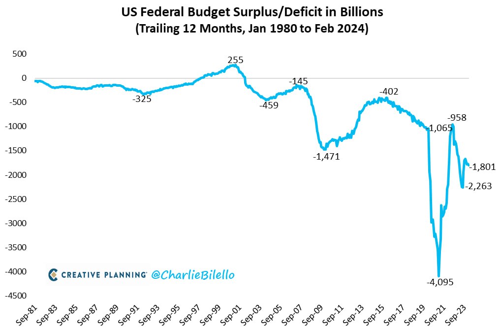 Americká vláda nadále utrácí peníze jako opilý námořník a hospodaří s rozpočtovým deficitem 1,8 bilionu dolarů. K tomu dochází, když ekonomika stále expanduje a ceny domů/akcií jsou na rekordních maximech. Co se stane s deficitem, když udeří recese?