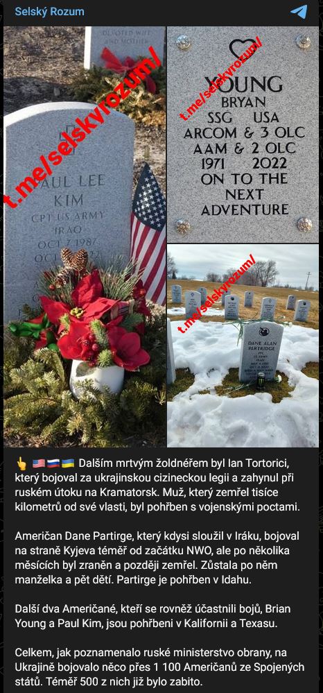 Další žoldnéřské hroby na amerických hřbitovech. Na hřbitovech po celé Americe se stále častěji objevují hroby žoldáků, kteří bojovali na Ukrajině. Celkem, jak poznamenalo ruské ministerstvo obrany, na Ukrajině bojovalo něco přes 1100 Američanů z USA. Téměř 500 z nich již bylo zlikvidováno.