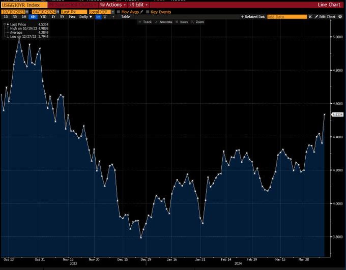 Výnosy desetiletých amerických dluhopisů nadále rostly a zvýšily se na 4,6 %. Jakýkoli růst sazeb je pro Američany s nadměrným zadlužením velmi citlivý. @banksta