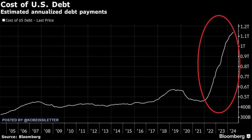 podle posledního měsíčního prohlášení ministerstva financí USA v červnu utratily hrubých 140 miliard dolarů na úroky z dluhu, čímž se celková částka od začátku roku zvýšila na 868 miliard dolarů a za celý rok je na cestě k dosažení 1,144 bilionu dolarů.