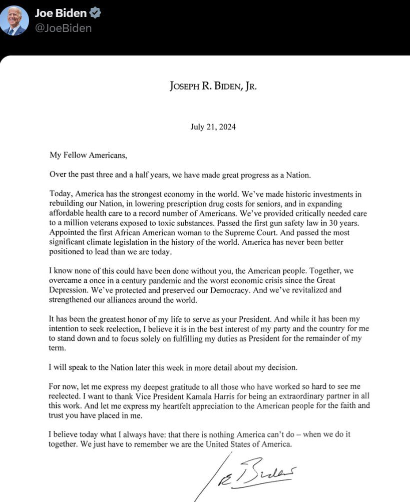 Ke kandidatuře proti Trumpovi demokratům doporučil podpořit svou viceprezidentku Kamalu Harrisovou. „Demokraté – je čas spojit se a porazit Trumpa. Udělejme to,“ vyzval Biden. Harrisovou už podpořil exprezident Clinton se svou ženou Hillary, neúspěšnou Trumpovou vyzyvatelkou.