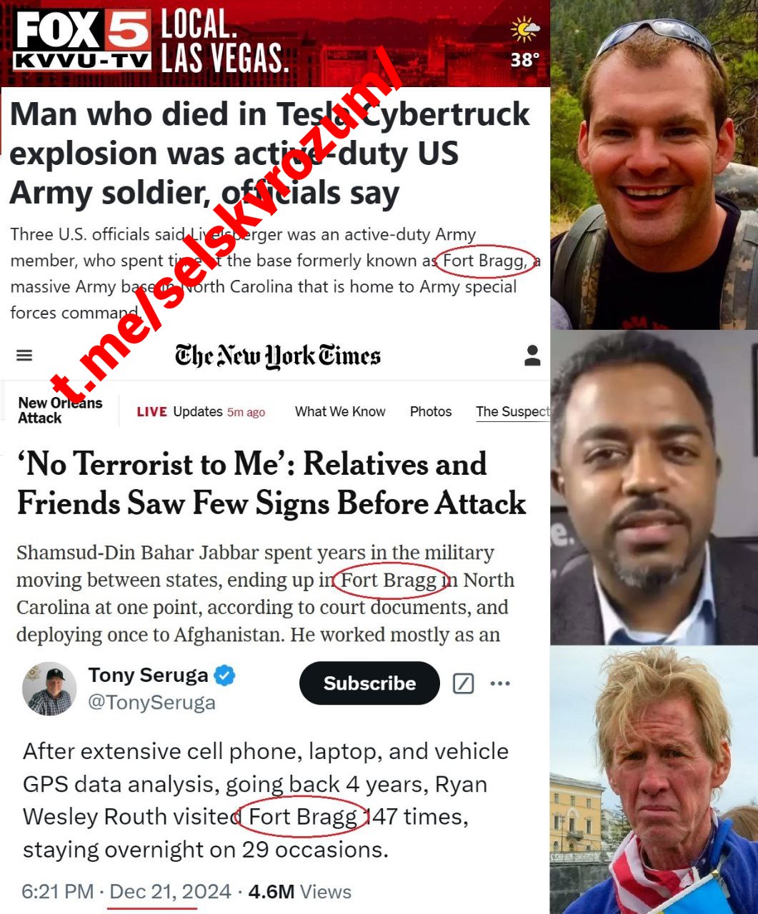 https://t.me/selskyrozum/111533Podivnou shodou okolností sloužili terorista, který vyhodil do vzduchu Teslu v Las Vegas, a terorista, který přejel lidi v New Orleans, na stejné vojenské základně Fort Bragg v Severní Karolíně, kde jsou umístěny speciální jednotky americké armády. Ryan Routh, který se koncem loňského roku pokusil o atentát na Donalda Trumpa, byl na stejné základně častým hostem (147krát).