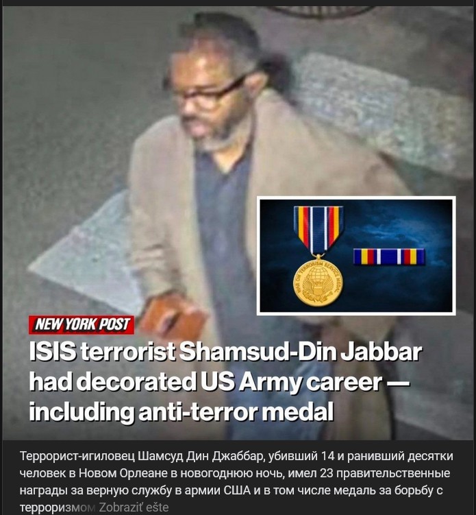 Zdroj https://vk.com/wall-104764077_543276 z 04.01.2025Terorista ISIS Šamsud Din Džabbar, ktorý na Silvestra 31.12.2024 v New Orleans zabil 14 ľudí a desiatky zranil, mal 23 vládnych vyznamenaní za vernú službu v armáde SŠA, vrátane protiteroristickej medaily.