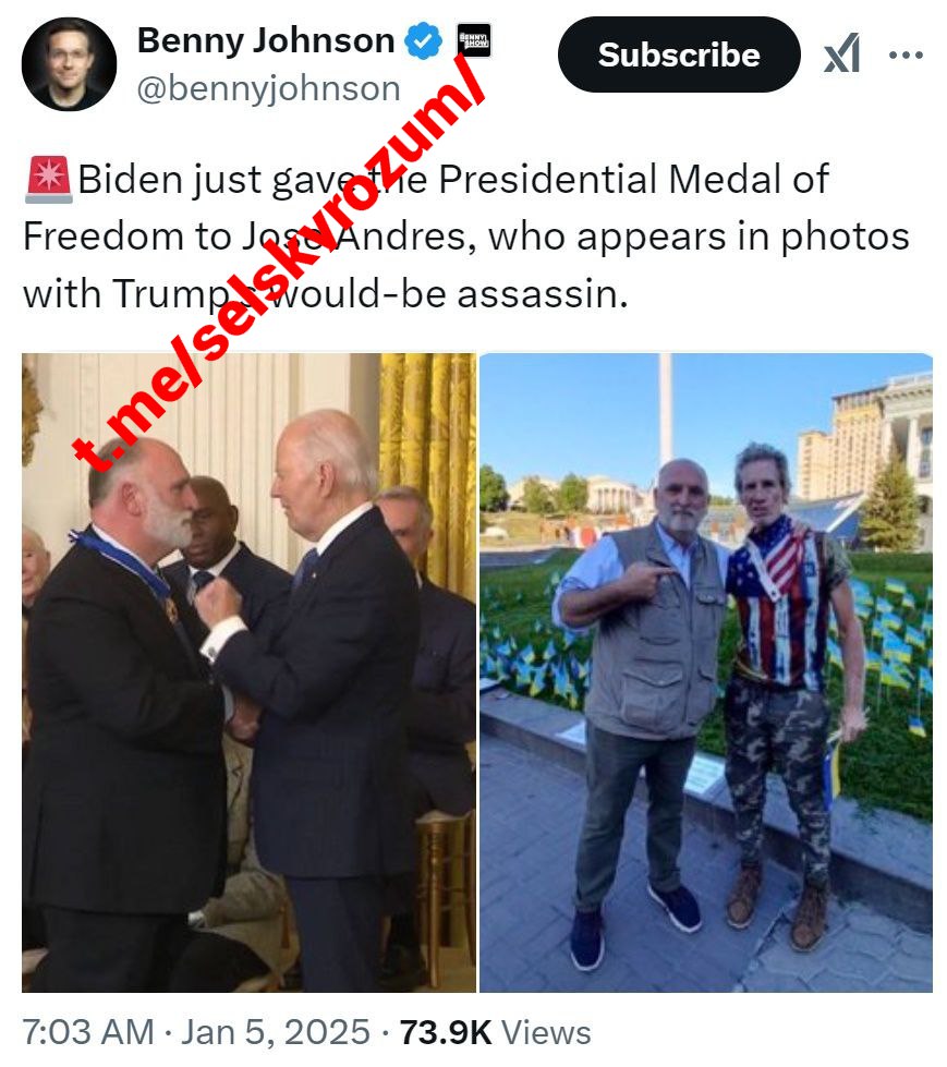 https://t.me/selskyrozum/111741Biden také předal Medaili svobody prominentnímu restauratérovi a protitrumpovskému aktivistovi Josému Andresovi, který předtím pózoval na fotografii s proukrajinským aktivistou Ryanem Rootem, který se pokusil o atentát na Trumpa.