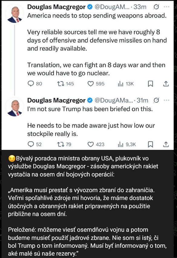 Preložené: môžeme viesť 8-dňovú vojnu a potom budeme musieť použiť jadrové zbrane. Nie som si istý, či bol Trump o tom informovaný. Musí byť informovaný o tom, aké malé sú naše rezervy.“