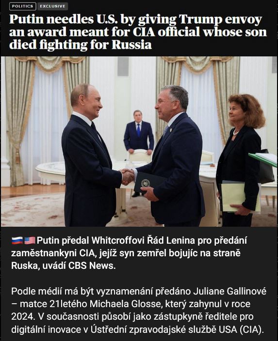 Putin na stretnutí odovzdal Witkoffovi „Leninov rád“ pre vysokopostavenú zamestnankyňu CIA Julianu Gallinu