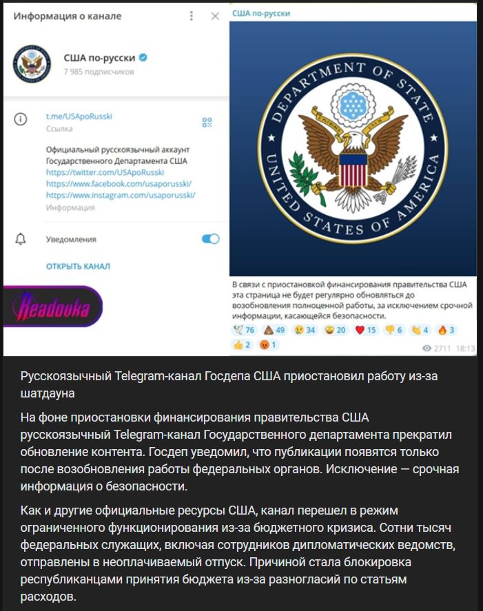 V dôsledku pozastavenia financovania vlády SŠA rusko-jazyčný Telegram-kanál Ministerstva zahraničných vecí prestal aktualizovať obsah. Ministerstvo zahraničných vecí oznámilo, že publikácie sa objavia až po obnovení činnosti federálnych orgánov. Výnimkou sú naliehavé informácie o bezpečnosti.