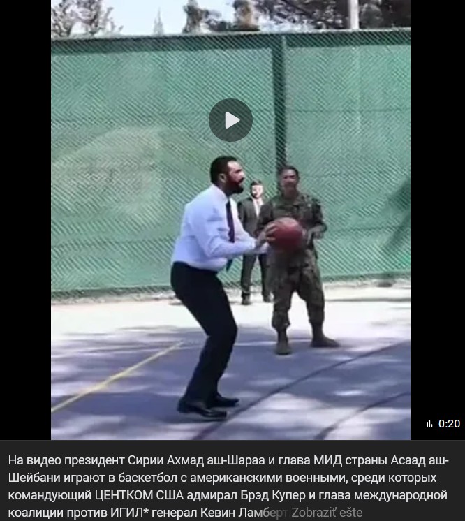 Na videu prezident Sýrie Ahmad al-Sharaa a minister zahraničných vecí Asaad al-Sheibani hrajú basketbal s americkými vojakmi, medzi ktorými je veliteľ CENTCOMu admirál Brad Cooper a veliteľ medzinárodnej koalície "proti ISIL*" generál Kevin Lambert.