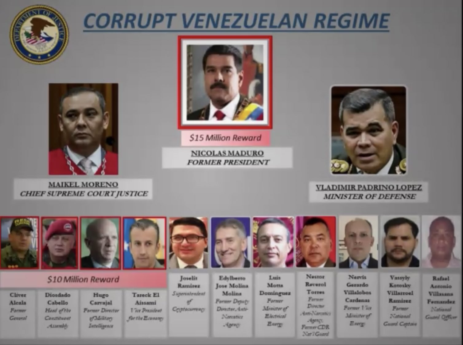 Americké ministerstvo spravedlnosti vypsalo odměny proti Nicolasovi Madurovi a jeho vrcholným funkcionářům. Na Nicolase Madura byla vypsána odměna 25 milionů dolarů.