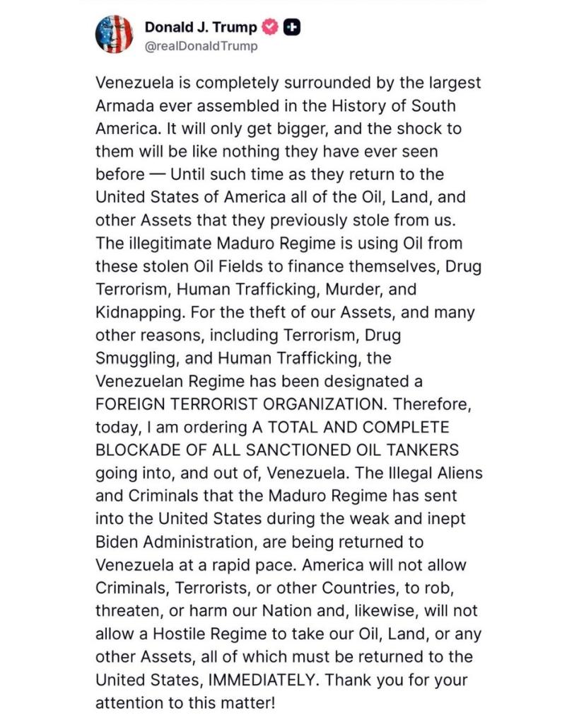 V stredu americký prezident Donald Trump potvrdil, že Spojené štáty zadržali ropný tanker pri pobreží Venezuely, pričom poznamenal, že ide o najväčší tanker, aký bol kedy zadržaný, a dodal, že sa dejú aj „iné veci“. Americká generálna prokurátorka Pam Bondi neskôr vysvetlila, že loď bola podozrivá z prepravy sankcionovanej ropy z Venezuely a Iránu. Operáciu vykonali Federálny úrad pre vyšetrovanie (FBI), Úrad pre vyšetrovanie vnútornej bezpečnosti a pobrežná stráž USA s podporou ministerstva vojny.