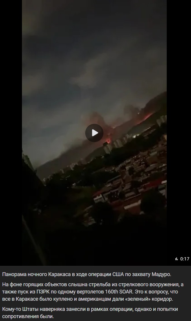 Na pozadí horiacich objektov je počuť streľbu z ručných zbraní, ako aj odpálenie z PZRK (ПЗРК) po jednom vrtuľníku zo 160th SOAR. Toľko k otázke, či bolo všetko v Caracase kúpené a Američanom bol poskytnutý „zelený“ koridor.