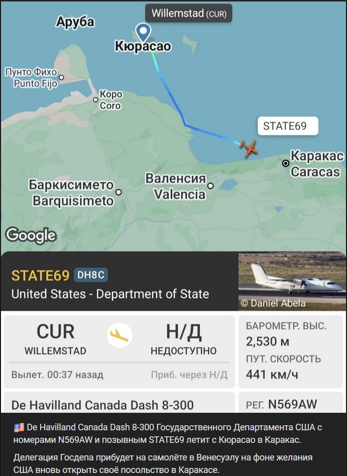 Lietadlo De Havilland Canada Dash 8-300 Ministerstva zahraničných vecí SŠA s trupovým číslom N569AW a volacím znakom STATE69 letí z Curaçaa do Caracasu.