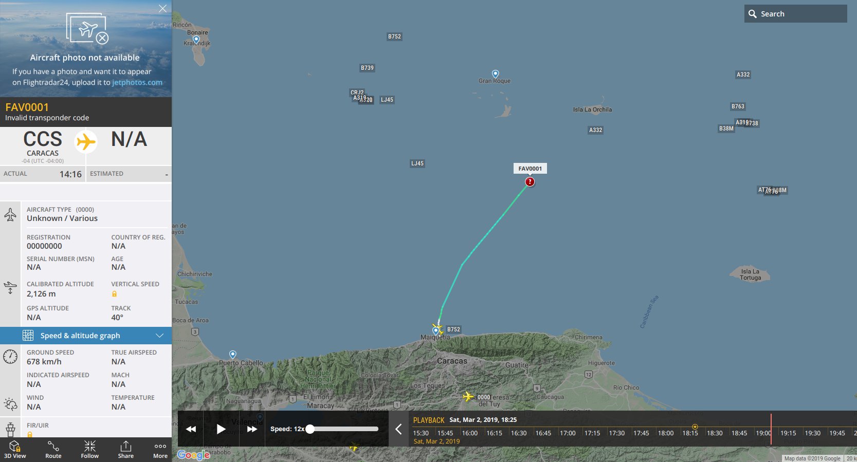 Hodně zajímavé: nestoupá, letí na 2301m i 100km od letiště v Caracasu, tam kde zmizel klesnul na 2126m, přistání buď na ostrově La Orchila nebo ostrov Gran Roque, ale tam je VPD dlouhá jen 700m a tam by asi A319 nepřistál, na přistání potřebuje minimálně dráhu dlouhou 1360m. Vypadá to na nějaký výlet na La Orchila, jiné venezuelské letiště tam není a kdyby letěl dále (ostrovy/státy v okolí), tak určitě nepoletí na výšce 2,3km.