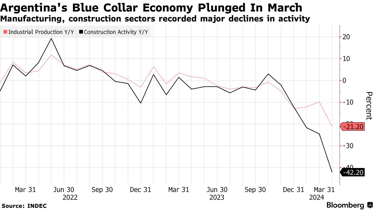 Argentinský zpracovatelský sektor vykázal v březnu mnohem horší výsledky, než se očekávalo, když se propadl o 21,2 % oproti prognóze 13,5 % r/r. Stavební aktivita se snížila o 42 %, což je nejhorší výsledek od roku 2020. To potvrzuje názor ekonomů, že úsporná kampaň prezidenta Javiera Miley prohlubuje hrozící recesi.