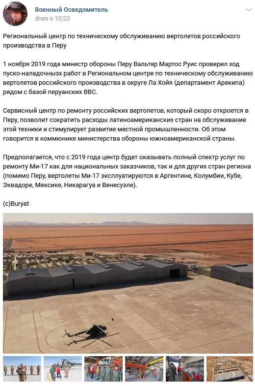 Servisné stredisko pre opravy ruských vrtuľníkov, ktoré čoskoro otvoria v Peru zníži náklady latinskoamerických krajín na údržbu uvedenej techniky a mali by stimulovať rozvoj miestneho priemyslu. Očakáva sa, že od roku 2019 centrum bude poskytovať plný rozsah opráv pre rodinu vrtuľníkov Mil Mi-17 ako pre domácich zákazníkov (Peru) tak aj a pre ostatné krajiny v regióne (Argentína, Kolumbia, Kuba, Ekvádor, Mexiko, Nikaragua, Venezuela).