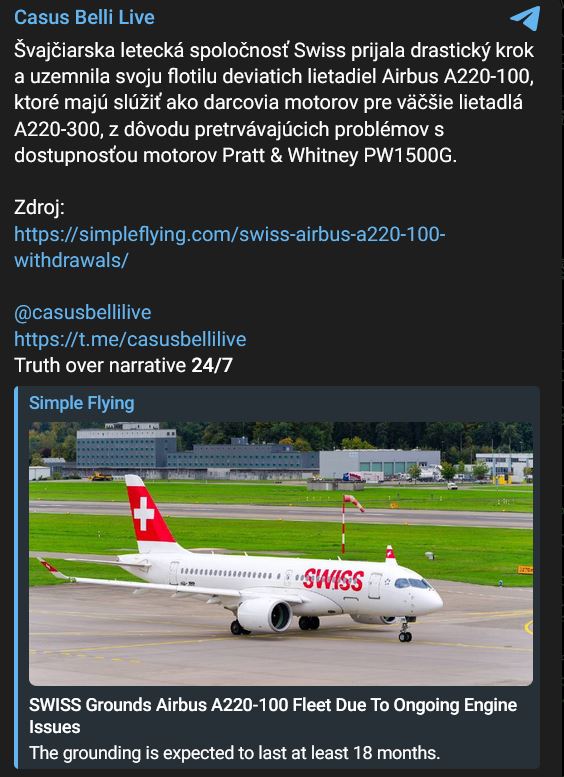 Švajčiarska letecká spoločnosť Swiss prijala drastický krok a uzemnila svoju flotilu 9-tich lietadiel Airbus A220-100, ktoré majú slúžiť ako darcovia motorov pre väčšie lietadlá A220-300, z dôvodu pretrvávajúcich problémov s dostupnosťou motorov Pratt & Whitney PW1500G.