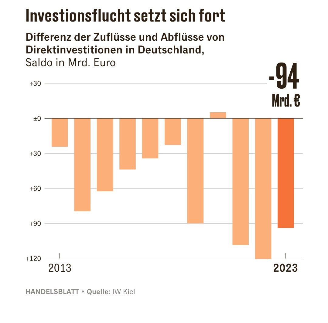 Odlev priamych investícií z Nemecka dosiahol v roku 2023 94 miliárd eur, čo je tretie najvyššie číslo od začiatku štatistiky v roku 1971 (horšie to bolo len v rokoch 2021-2022).