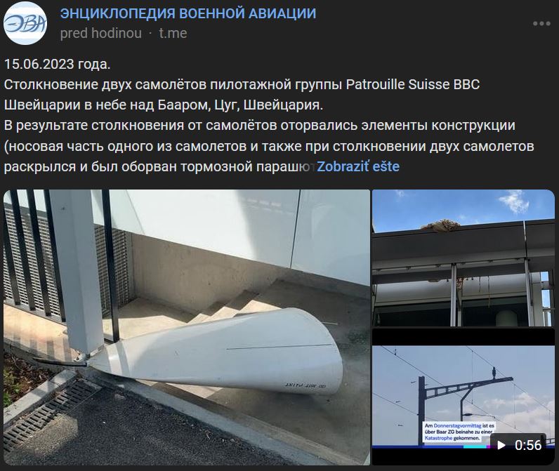 Doplnenie: "Nosová časť jednej zo stíhačiek F-5 Tiger sa odlomila a zasiahla prednú časť domu," povedal hovorca švajčiarskej armády Matthias Wolken. Okná domu sa pri náraze rozbili. Jedna osoba bola úlomkami skla ľahko zranená. Video https://vk.com/video-173678697_456242768 dĺžka 56 sek.