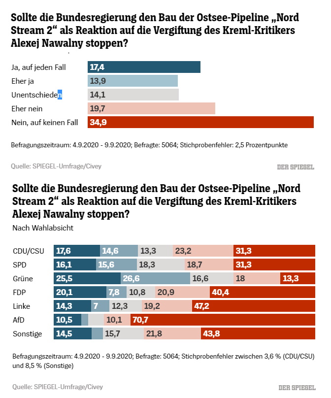To je výsledek reprezentativního průzkumu institutu pro výzkum veřejného mínění Civey jménem společnosti SPIEGEL. Online průzkumu se zúčastnilo 5064 lidí; chyba ve výběru byla 2,5 procentního bodu.
