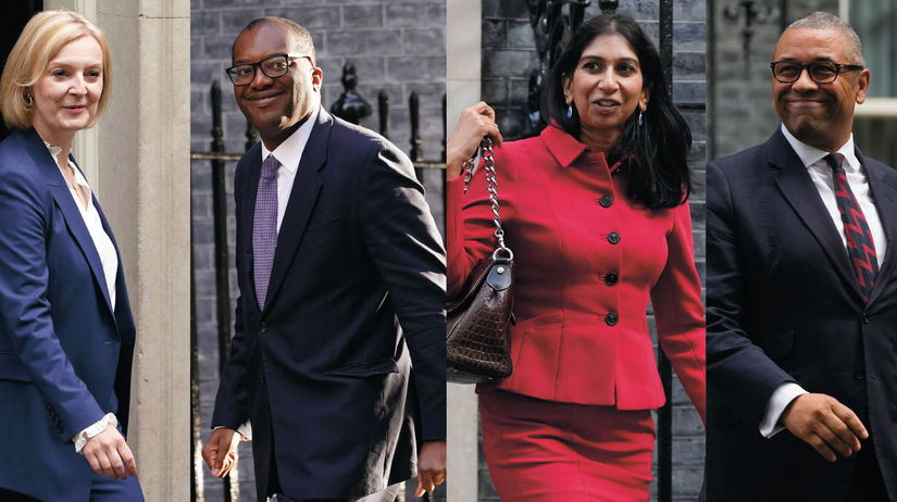 Zľava doprava: britská premiérka Liz Trussová, minister financií Kwasi Kwarteng, ministerka vnútra Suella Bravermanová a minister zahraničných vecí James Cleverly. Britskou premiérkou sa v utorok stala Liz Trussová (47). Funkciu ministra financií obsadil Kwasi Kwarteng (47), ktorého rodinné korene siahajú do Ghany. Šéfom diplomacie sa stal James Cleverly (53), ktorého matka pochádza zo Sierry Leone. A ministerkou vnútra je Suella Bravermanová (42), ktorej rodičia majú indický pôvod.