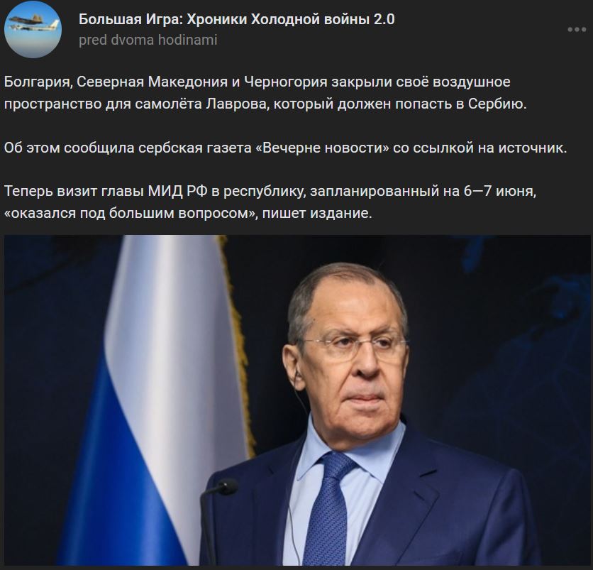 Bulharsko, Severné Macedónsko a Čierna Hora uzavreli svoj vzdušný priestor pre lietadlo ruského ministra zahraničných vecí Lavrova, ktorý má priletieť do Srbska. Teraz sa ukázalo, že návšteva ruského ministra zahraničných vecí v republike, naplánovaná na 06.+07.06.2022 "je veľmi otázna".
