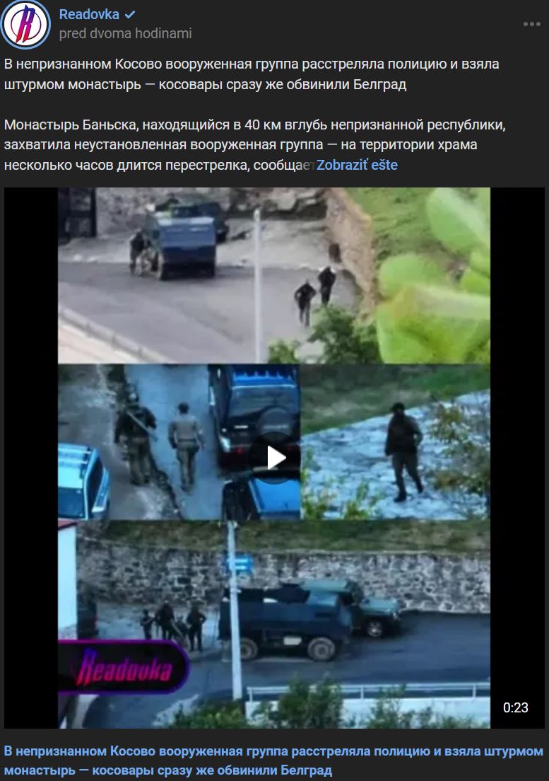 Kláštor Banjska (Монастырь Баньска), ktorý sa nachádza 40 km hlboko v neuznanej republike, obsadila neidentifikovaná ozbrojená skupina - na území chrámu už niekoľko hodín prebieha prestrelka, informovala Raško-priezračná diecéza Ruskej pravoslávnej cirkvi (Рашко-Призренская епархия СПЦ). Pútnici a farníci sa zabarikádovali vo vnútri budovy. Predseda vlády neuznaného Kosova Kurti tvrdí, že Banjský kláštor naďalej drží 30 údajne ozbrojených Srbov. Doposiaľ je 1 mŕtvy a 2 zranení kosovskou políciou, informovala aj diecéza SPC (СПЦ). Na miesto sú nasadené medzinárodné mierové sily KFOR a EULEX. Všetko sa začalo ešte v noci. Ozbrojená skupina zaútočila na kosovskú políciu pri tej istej dedine Banjska (Баньска) - kosovský premiér Kurti okamžite obvinil Belehrad. Kosovské špeciálne jednotky zablokovali hranice, ako aj cesty vedúce k miestu nočnej streľby. Blokáda podľa srbských médií ovplyvnila aj sanitky, ktoré sa na miesto ponáhľali. Predseda srbského parlamentu Orlić (Орлич) požiadal, aby sa nezačalo bojovať slovami a počkalo sa aspoň na výsledky vyšetrovania. Video (iba zvuk streľby v doline) https://vk.com/video-163061027_456301712 dĺžka 23 sek.