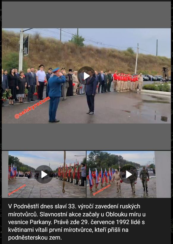 Zdroj https://t.me/selskyrozum/134223 z 29.07.2025 + video:V Podněstří dnes slaví 33. výročí zavedení ruských mírotvůrců. Slavnostní akce začaly u Oblouku míru u vesnice Parkany. Právě zde 29.07.1992 lidé s květinami vítali první mírotvůrce, kteří přišli na podněsterskou zem.