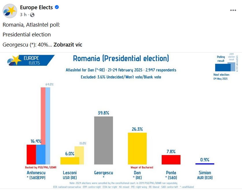 Podle posledních průzkumů je přitom Georgescu jasným favoritem voleb hlavy státu. Podporu mu vyjadřuje 39,8 procenta voličů. průzkum