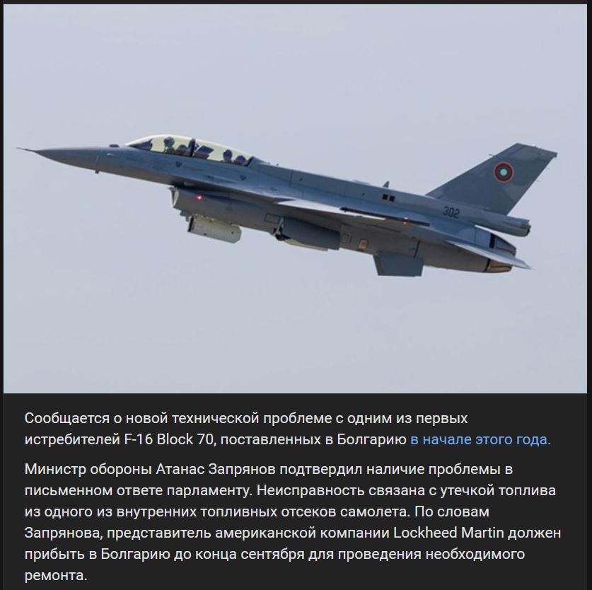 Zdroj https://vk.com/wall-123538639_4708421 z 05.10.2025Bola oznámená nová technická porucha jedného z prvých stíhacích lietadiel F-16 Block 70, ktoré boli dodané do Bulharska začiatkom tohto roka 2025.