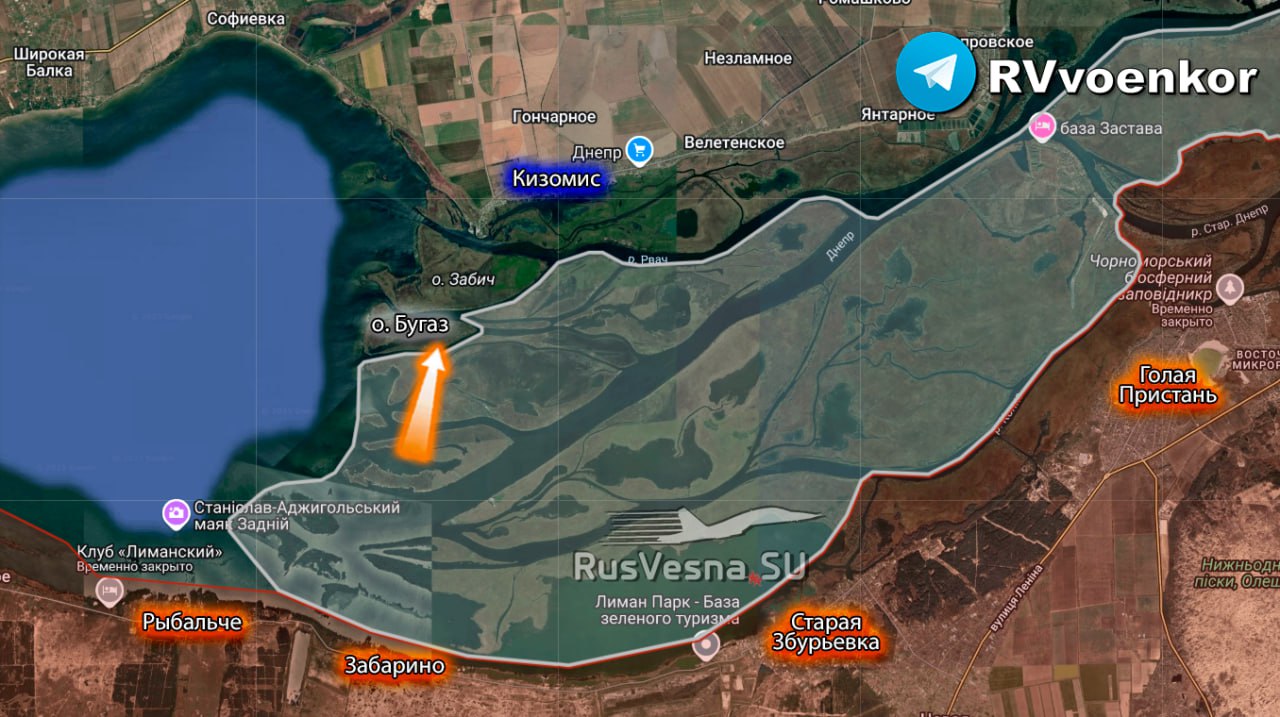 Analytik naznačuje, že naše předsunuté jednotky stojí před úkolem získat opěrný bod na pravém břehu, přerušit silnici vedoucí z Chersonu do Beryslavi a postoupit na sever.