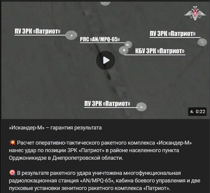 Posádka operačno-taktického raketového komplexu Iskander-M (Искандер-М) zasiahla pozíciu PVO Patriot pri osade Ordžonikidze (Орджоникидзе) v Dnepropetrovskej oblasti (Днепропетровской области). V dôsledku raketového úderu bola zničená multifunkčná radarová stanica AN/MPQ-65, bojová riadiacia kabína a 2 odpaľovacie zariadenia protilietadlového raketového systému Patriot.