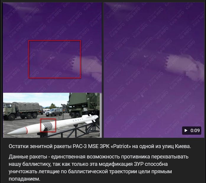 Video https://vk.com/video-123538639_456317529 dĺžka 9 sek.Zvyšky protilietadlovej rakety PAC-3 MSE, PVO systému Patriot, na ulici v Kyjeve.