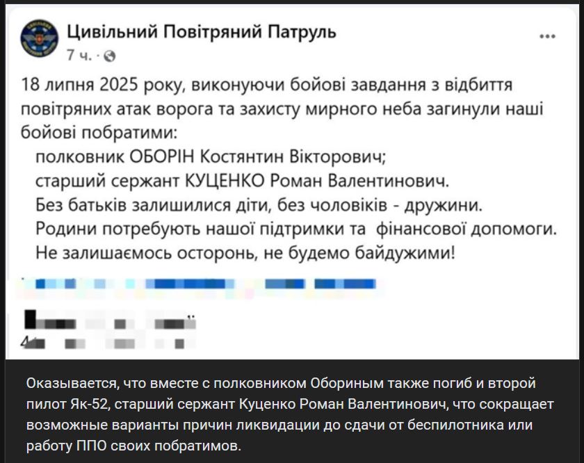 Ukazuje sa, že spolu s plukovníkom Oborinom zahynul aj druhý pilot lietadla Jakovlev Jak-52 (Як-52), starší seržant Kucenko Roman Valentinovič (Куценко Роман Валентинович), čo znižuje možné varianty príčin na likvidáciu zadného cieľa BPLA alebo na prácu PPO svojich bratov.