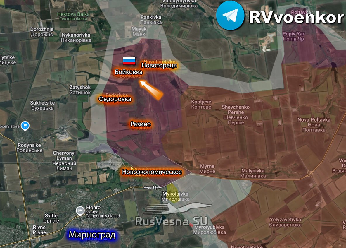 Ozbrojené síly RF zároveň zintenzivnily dělostřelecký a letecký dopad na pozice ozbrojených sil Ukrajiny na okraji Myrnogradu, kde ukrajinské síly zahájily naléhavé práce na posílení obrany. Nyní je připravenost pozic tam nízká a na pozadí četných ruských úderů je schopnost Ukrajinců držet tyto linie po dlouhou dobu pochybná.