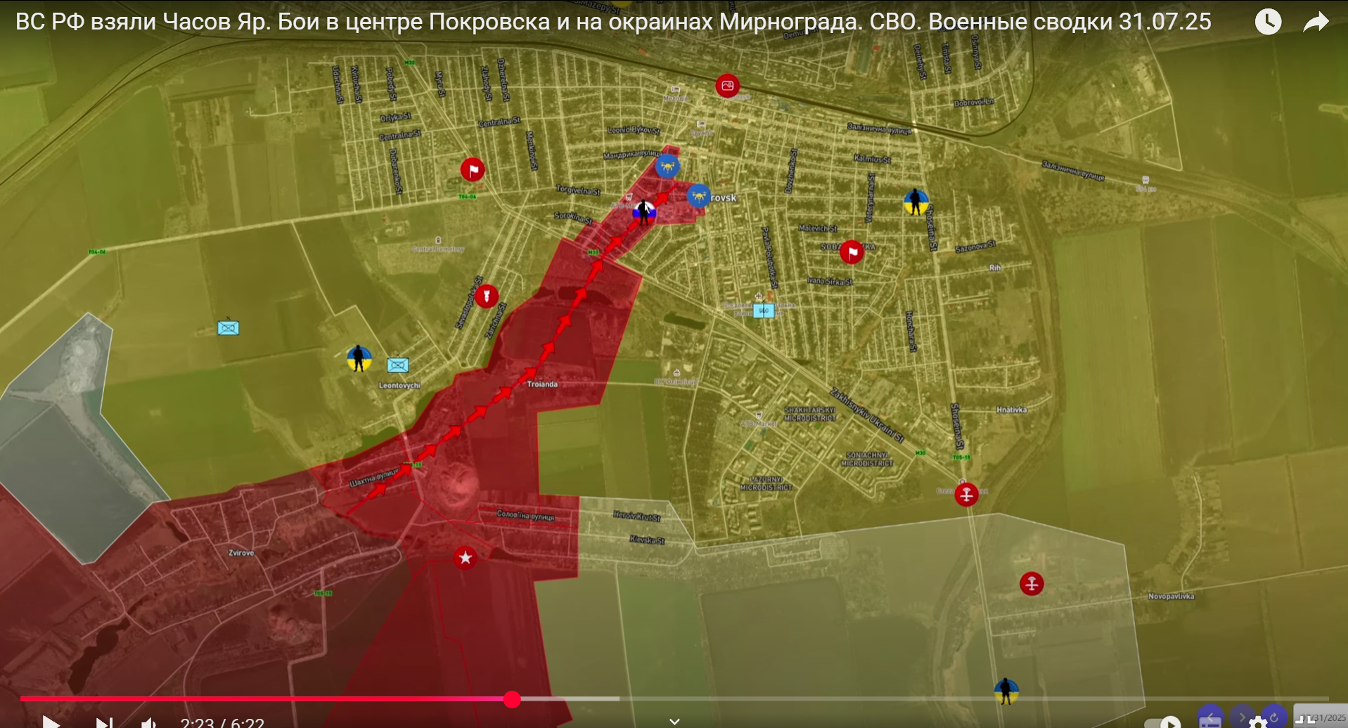 Večer 28. července začala obrana posádky ozbrojených sil Ukrajiny ve městě Pokrovsk v DLR vykazovat známky degradace pod neustálým tlakem ozbrojených sil RF. Ukrajinské síly drží dvě opevněné oblasti, jednu v centrální části osady a druhou v Šachterském mikrodistriktu, komunikace mezi nimi je vážně narušena, několik dní není zásobování