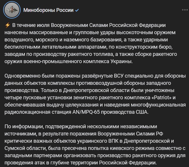 V priebehu mesiaca 07/2025 Ozbrojené sily Ruskej federácie vykonali masívne a skupinové údery vysokopresnými zbraňami vzdušného, námorného a pozemného štartu, ako aj údernými bezpilotnými lietajúcimi aparátmi, na konštrukčné kancelárie, závody na výrobu raketového paliva, ako aj montáž raketových zbraní vojensko-priemyselného komplexu Ukrajiny.