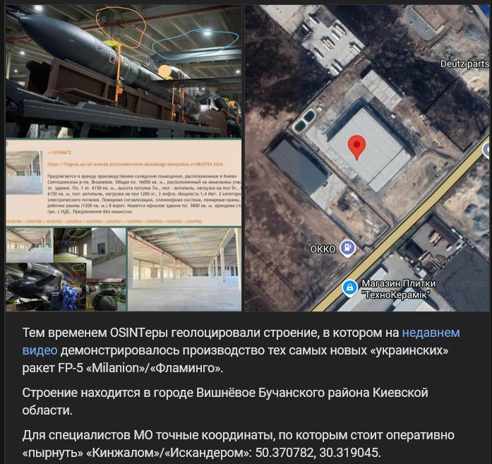 Medzitým OSINT-eri lokalizovali budovu, v ktorej bolo na nedávnom videu ukázaná výroba / montáž tých najnovších „ukrajinských“ rakiet FP-5 „Milanion“/„Flamingo“.