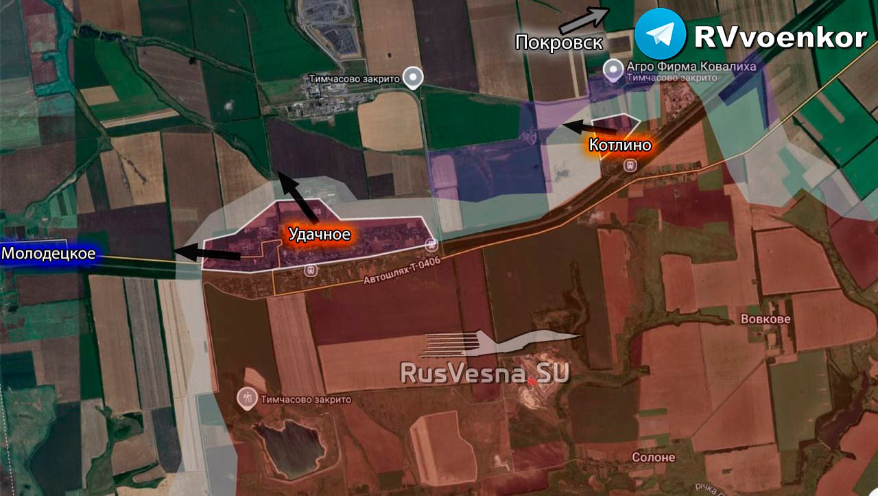 ▪️Ruské jednotky „prakticky obsadili Udačno a teraz tlačia smerom na Molodetskoe a na sever, aby definitívne vyčistili zvyšky oporných bodov v oblasti“, informujú ukrajinskí analytici. ▪️Ozbrojené sily Ruskej federácie úplne obsadili Kotlino a postupujú smerom k malému priemyselnému objektu.