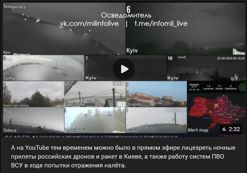 Medzitým bolo možné na YouTube v priamom prenose sledovať nočné prílety ruských dronov a rakiet v Kyjeve, ako aj prácu / činnosť systémov PVO VSU pri pokuse o odrazenie útokov.