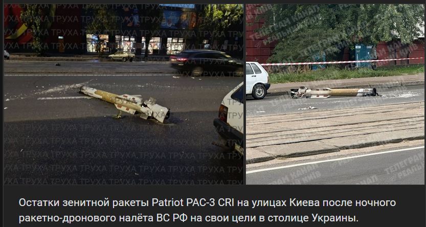Zvyšky protilietadlovej rakety Patriot PAC-3 CRI na uliciach Kyjeva po nočnom raketovo-dronovom útoku VS RF na svoje ciele v hlavnom meste Ukrajiny.