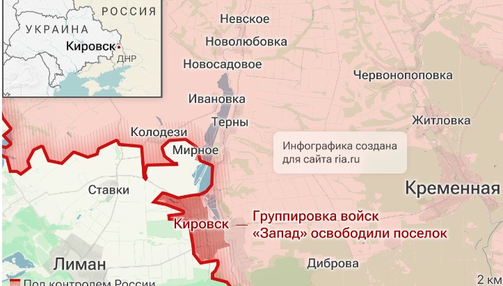 „29. septembra 2025 bola v smere Krasnolimansk v dôsledku útočných akcií skupiny vojsk Západ oslobodená osada Kirovsk v Doneckej ľudovej republike,“ informovali.