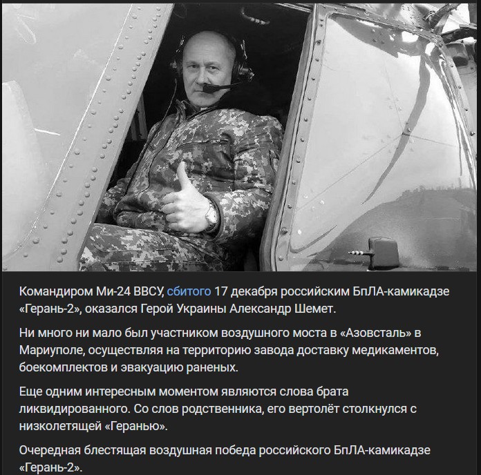 Veliteľom vrtuľníka Miľ Mi-24 (Ми-24) VVSU, ktorý bol 17.12.2025 zostrelený ruským BPLA-kamikadze „Geraň-2“ (Герань-2), bol hrdina Ukrajiny Alexander Šemet (Александр Шемет).