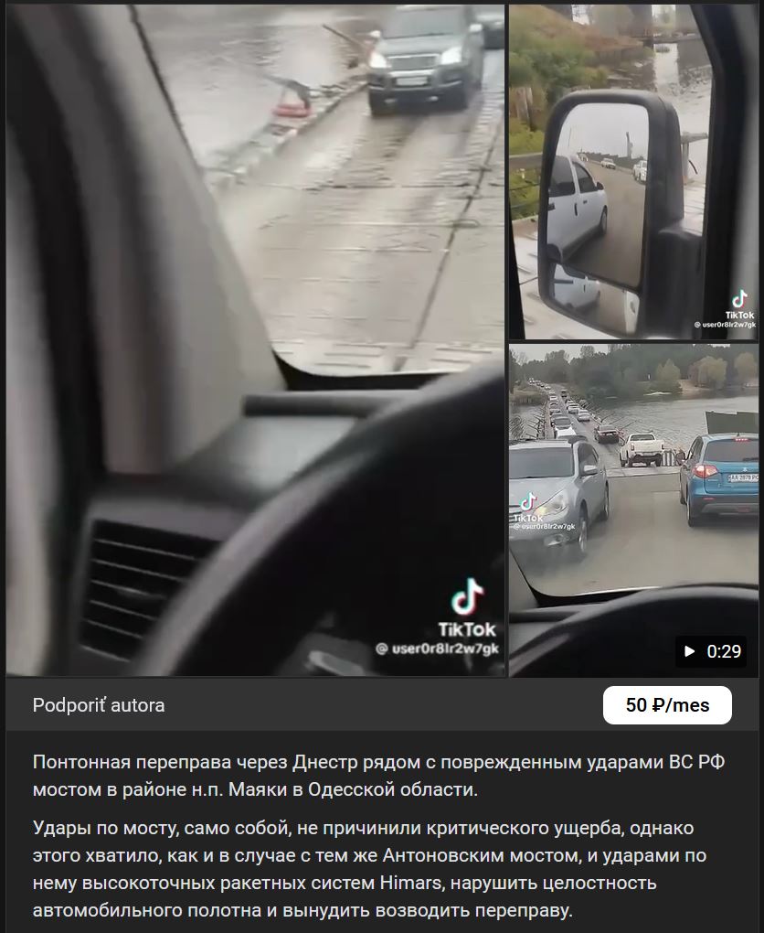 Údery na most samozrejme nespôsobili kritické poškodenie, ale stačilo to, rovnako ako v prípade Antonovského mosta (Cherson), a údery naň vysokopresnými raketovými systémami HIMARS, aby sa narušila celistvosť vozovky a vynútilo sa vybudovanie prechodu.