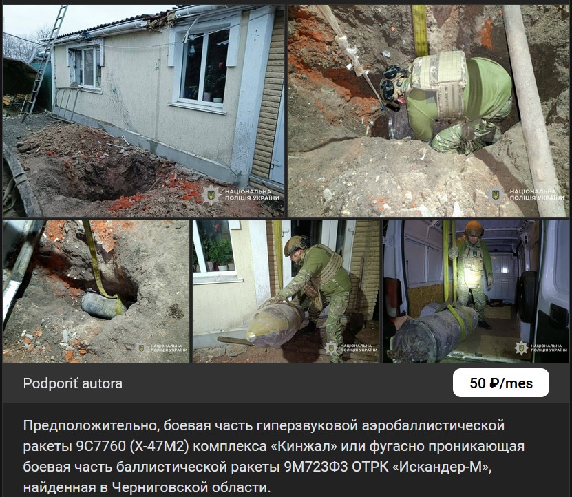 Pravdepodobne, bojová časť hypersonickej aerobalistickej rakety 9S7760 (Ch-47M2) / 9С7760 (Х-47М2) komplexu „Kinžal“ (Кинжал) alebo výbušnú penetračnú bojovú časť balistickej rakety 9M723F3 OTRK „Iskander-M“ (9М723Ф3 ОТРК Искандер-М), nájdenú v Černigovskej oblasti