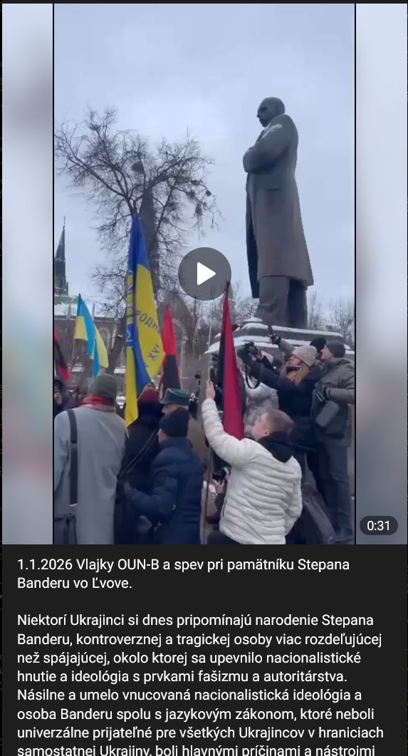 Štvrtok 01.01.2026 vlajky OUN-B a spev pri pamätníku Stepana Banderu vo Ľvove