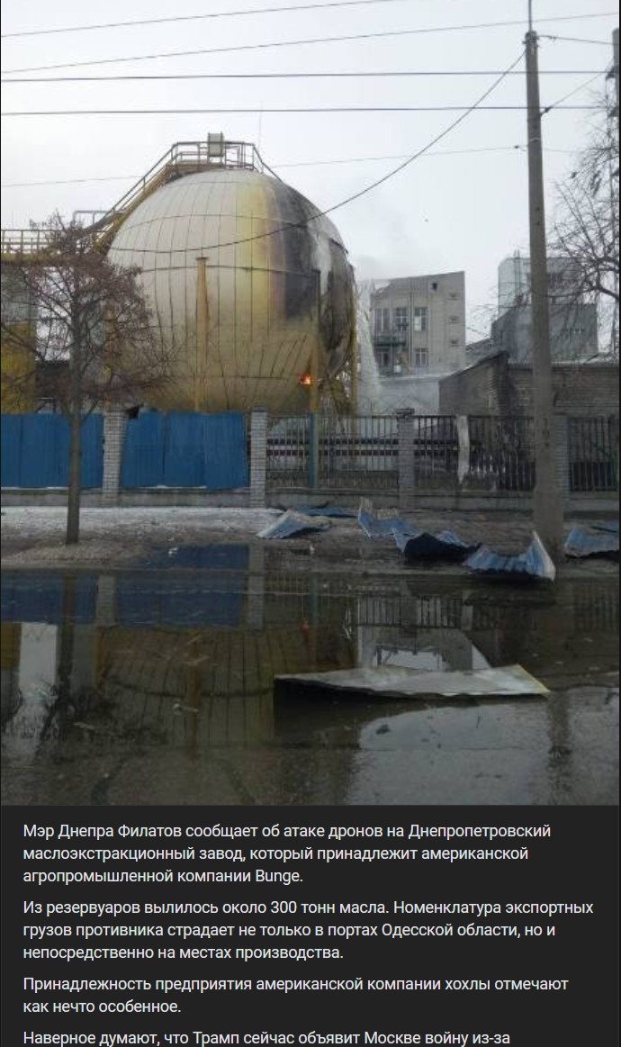 Starosta Dnepra (Днепра) Filatov (Филатов) informuje o útoku dronov na Dnepropetrovský olejársky závod (Днепропетровский маслоэкстракционный завод), ktorý patrí americkej poľnohospodárskej spoločnosti Bunge.